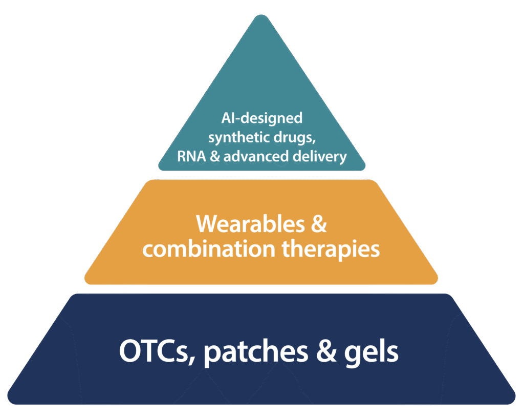Dapi’s Discovery Pyramid is our innovation framework — a strategic roadmap guiding our progression from simple over-the-counter solutions to advanced, AI-powered therapies. Built on years of research and refined by our team of experts, the pyramid illustrates how the PharmaMedic brand transforms an idea into a tangible, life-changing treatment.